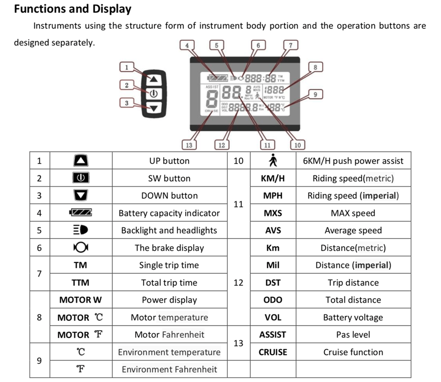 As a part of the ebike, ebike LED/ LCD display plays an important role in the whole ebike system. If we say controller is the brain of the ebike, motor is the arm and leg of the ebike, then LED/ LCD display would combine the function of them. Especially, the LCD display is the important feature that highlights the benefits of integrated technology that characterizes the electric bike. Most people are only familiar with the ebike speedometer, but the LCD display keep eyes on the values of all the vital parameters that you need to be aware of while you are riding. It includes multiply functions, such as the speed, mileage, pedal assist, battery voltage, USB charging, real-time power output, automatic prompt function---Different failure codes are prompted to facilitate the inspection and maintenance of the vehicle. There is no doubt that the major advantage of LCD displays on e-bikes is they let riders monitor their performance and adjust according to the reflected data. Under this condition, riders can push themselves to the limits of their endurance. The LED/LCD display doesn’t make any sense unless the rider know the features it has and the vitality of the information it conveys. Therefore, users should be familiar with the various display features.