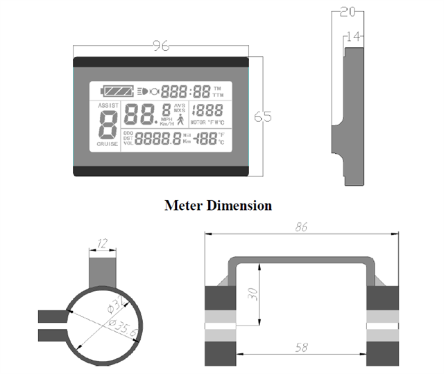 1. Data display function: It shows riding speed, single mileage and accumulated mileage, riding timing, assist gear, motor operating power and temperature, battery voltage and power status, brake status, and Ambient temperature and other cycling parameters.