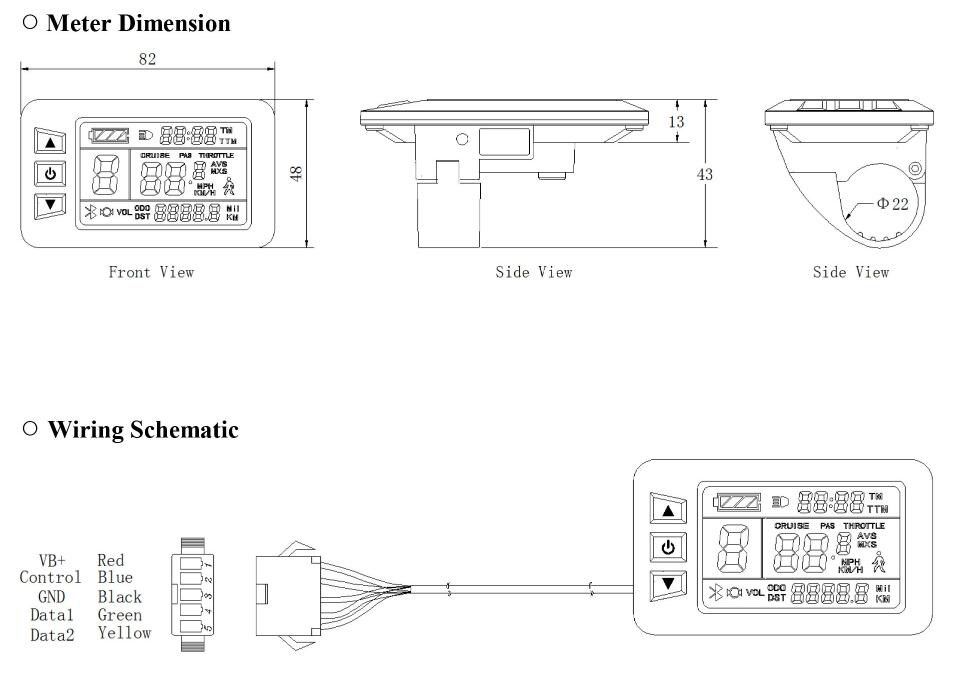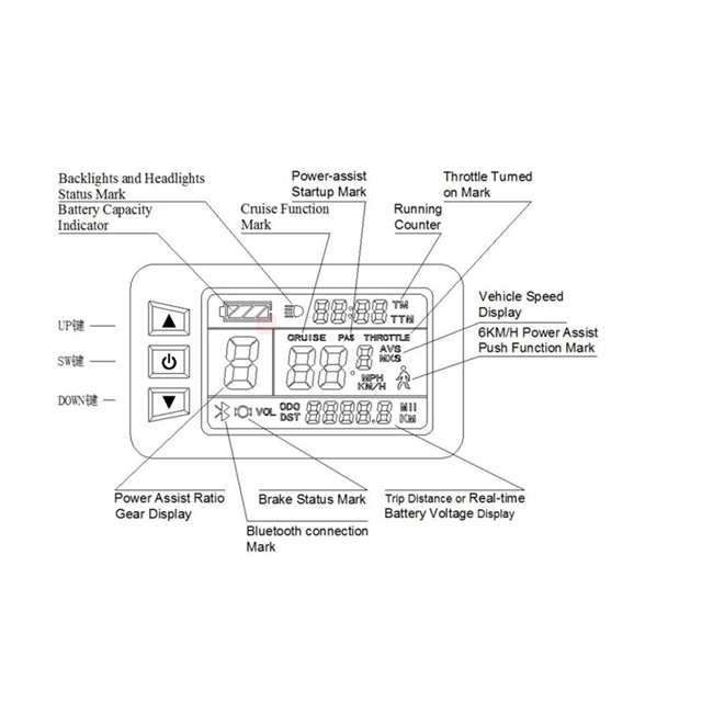 1. Data display function: It shows riding speed, single mileage and accumulated mileage, riding timing, assist gear, motor operating power and temperature, battery voltage and power status, brake status, and Ambient temperature and other cycling parameters.